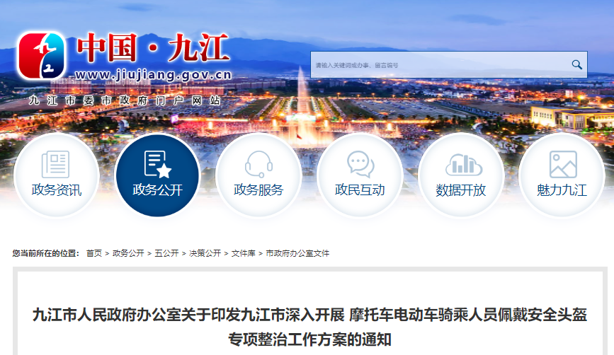 点击左下角“阅读原文”,查看《九江市人民政府办公室关于印发九江市深入开展摩托车电动车骑乘人员佩戴安全头盔专项整治工作方案的通知》全文