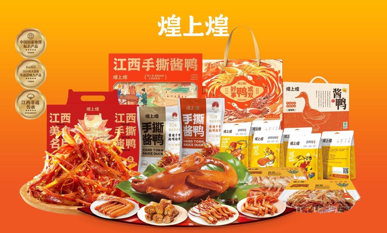 煌上煌开发出6大系列100多种风味独特、深受消费者喜爱的快捷消费酱卤肉制品,涵盖鲜货、乐鲜装、包装食品等,其中酱鸭产品被中国食品协会誉为“全国第一家独特酱鸭产品”。该品类采用省级非遗豫章酱卤制作技艺,选用国家地理标志产品“莲塘麻鸭”为原料,采用28味植物香辛料、历经32道秘制工序,核心产品煌上煌手撕酱鸭是江西人家喻户晓和热衷喜爱的美食特产,年销售1000万份,单品年销售额达到近5亿元,被列为“江西美食名片”,曾荣获“2023年国际蒙特奖”、福布斯“2024大消费年度影响力产品”、第四届江西生态鄱阳湖·绿色农产品博览会金奖等大奖。