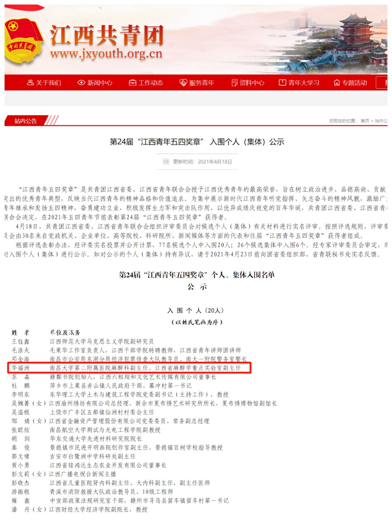 日前,共青团江西省委、江西省青年联合会授予19人第24届“江西青年五四奖章”称号,授予6个集体第24届“江西青年五四奖章集体”称号。南昌大学第二附属医院麻醉科副主任、江西省麻醉学重点实验室副主任华福洲荣获“江西青年五四奖章”。