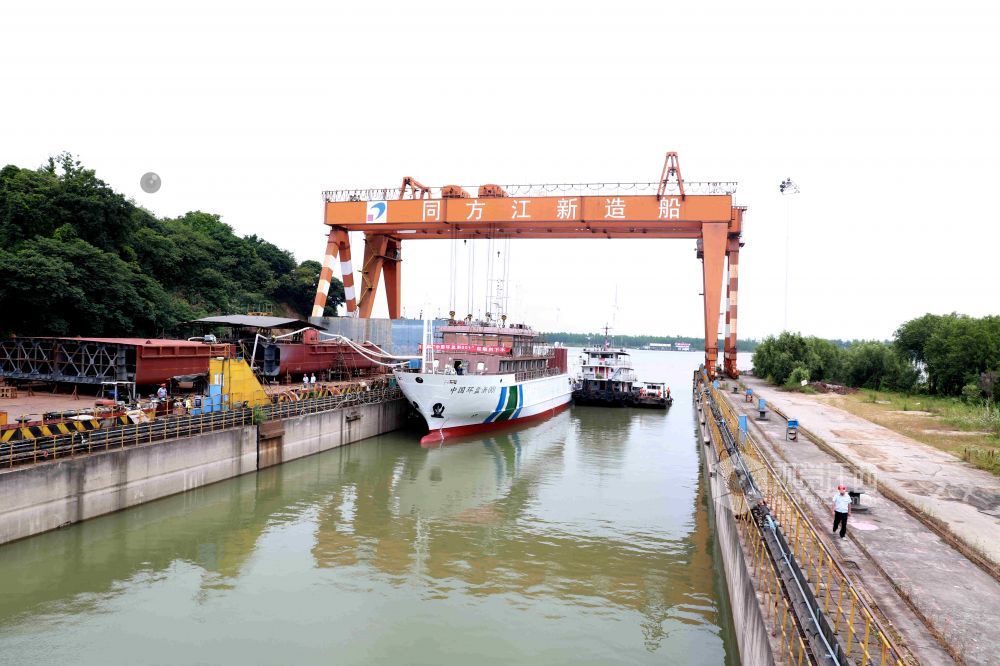 2021年6月10日上午,随着“中国环监浙001”的船体顺利起浮,我国千吨级近海生态环境监测船在江西省九江市湖口县同方江新造船有限公司万吨级船坞码头按生产建造大节点如期下水。该船舶由湖口县同方江新造船有限公司为浙江省海洋生态环境监测中心建造的,是目前已建成下水的我国千吨级先进的专业化海洋生态环境监测船,将于今年8月交付使用。该船舶正式入列后,将全面提升沿海省份近岸海域及其他沿海海洋生态环境监测的数字化、网络化、智能化水平,助力海洋生态文明建设,促进海洋生态环境监测高质量发展。 视觉江西 郑飞华 摄