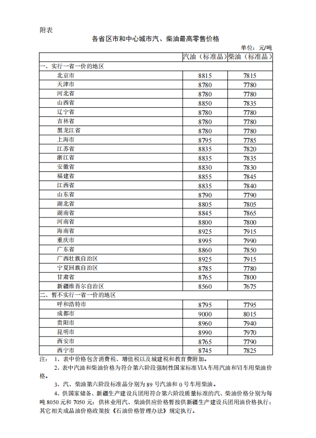 根据近期国际市场油价变化情况,按照现行成品油价格形成机制,自2021年6月28日24时起,国内汽、柴油价格(标准品,下同)每吨分别提高225元和215元。调整后,各省(区、市)和中心城市汽、柴油最高零售价格见附表。相关价格联动及补贴政策按现行规定执行。