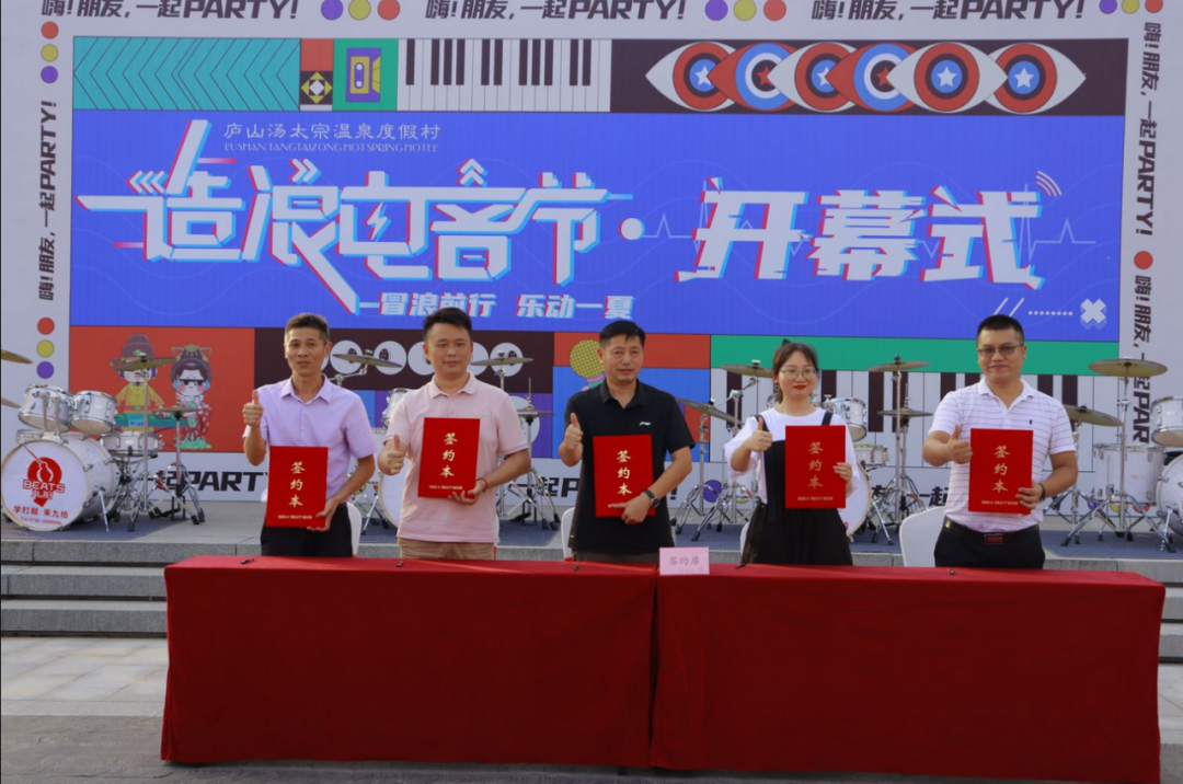 南昌赣游通、南昌美景旅行社、湖北中青旅、九江智游旅行社的负责人和汤太宗温泉总经理助理李福林签署产品代理协议。大家表示,汤太宗温泉融入潮流、时尚、动感等电音元素,为温泉旅游提供了一个非常好的思路。