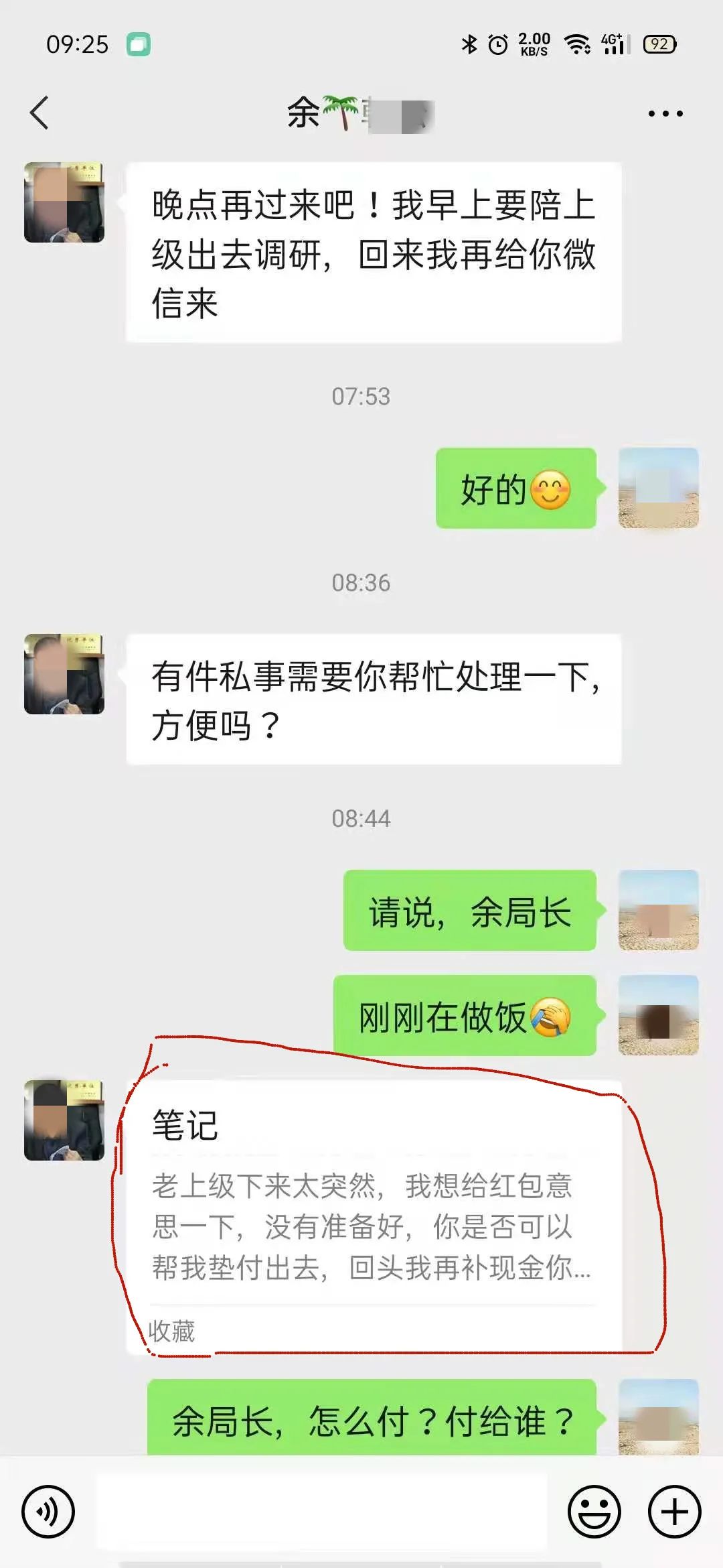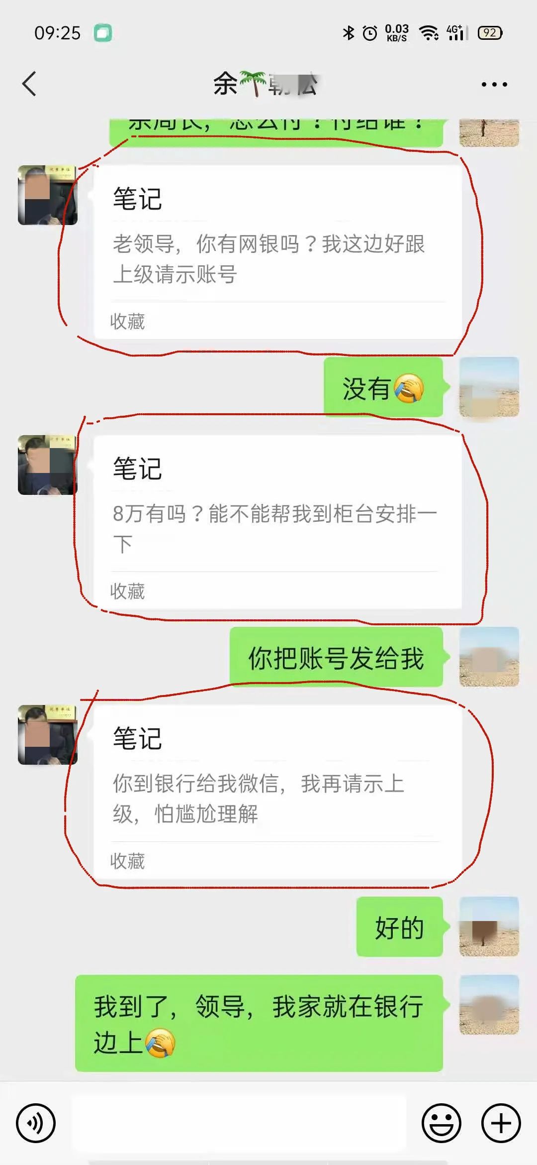 “余局长”就 转发了一段信息 (注: 收藏好的笔记) 给聂女士,称自己要给老上级包红包,但没有准备,让聂女士垫付一下,回头再还给聂女士。“余局长”连续发送几段收藏好的笔记给聂女士,让其到银行柜台转8万元钱到指定的账户,然后把转账回执单发送他。