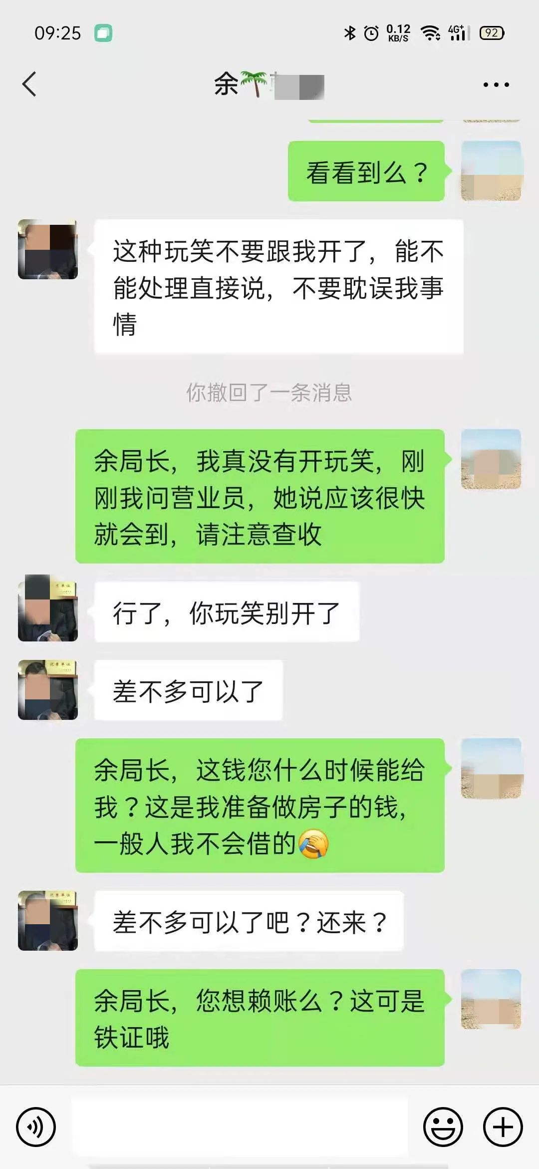 钱没有要到,还被人赖上一笔账,这“领导”最后也是被聂女士怼的没话说了,截至到目前,“余局长”还没有回信息,可能已经把聂女士的微信拉黑了。