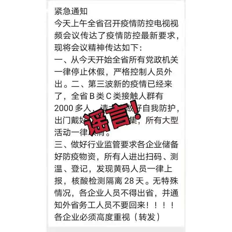 7月31日晚,江西省疫情防控指挥部办公室发布消息称,近期,个别网站、微信群传播江西省疫情防控不实信息,造成不良社会影响,请广大网友密切关注政府及省疫情防控指挥部办公室网站、微信公众号等及时了解江西省疫情防控信息,做到不信谣、不传谣。