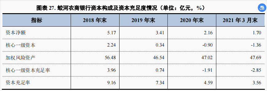截至2021年3月,该行资本充足率为3.56%,核心一级资本充足率为-2.85%,均不满足监管要求。此外,评级报告还透露,面对较大的资本补充压力,目前为止,该行有引入战略投资者考虑,但尚无实质进展。