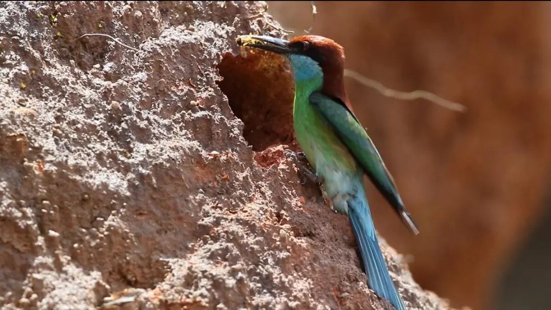 九连山保护区优美的生态环境,给来此繁衍栖息的夏季候鸟提供了良好的条件,周边地区群众的保护意识不断增强,迎来了众多美丽的夏候鸟蓝喉蜂虎来此繁殖。经几天的仔细观察后发现有只蓝喉蜂虎频繁衔着昆虫进出,估测正繁育后代,保护的工作人员拍下了蓝喉蜂虎捕食、喂食幼鸟的珍贵画面。