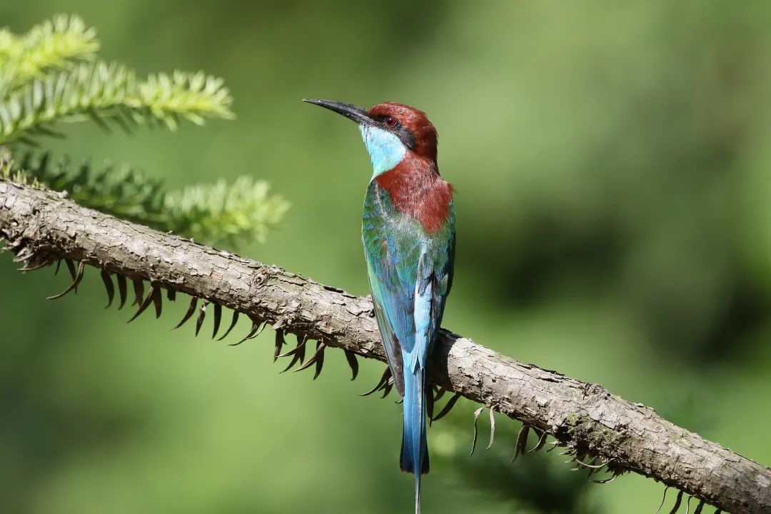 据相关资料显示,蓝喉蜂虎国内主要分布于国内分布于西南、华南、东南和华南,在九连山属夏候鸟,长江以南地区为不常见鸟,野外非常少见,它们对生态环境要求较高。我国新调整的《国家重点保护野生动物名录》中把蓝喉蜂虎列为国家二级重点保护动物。
