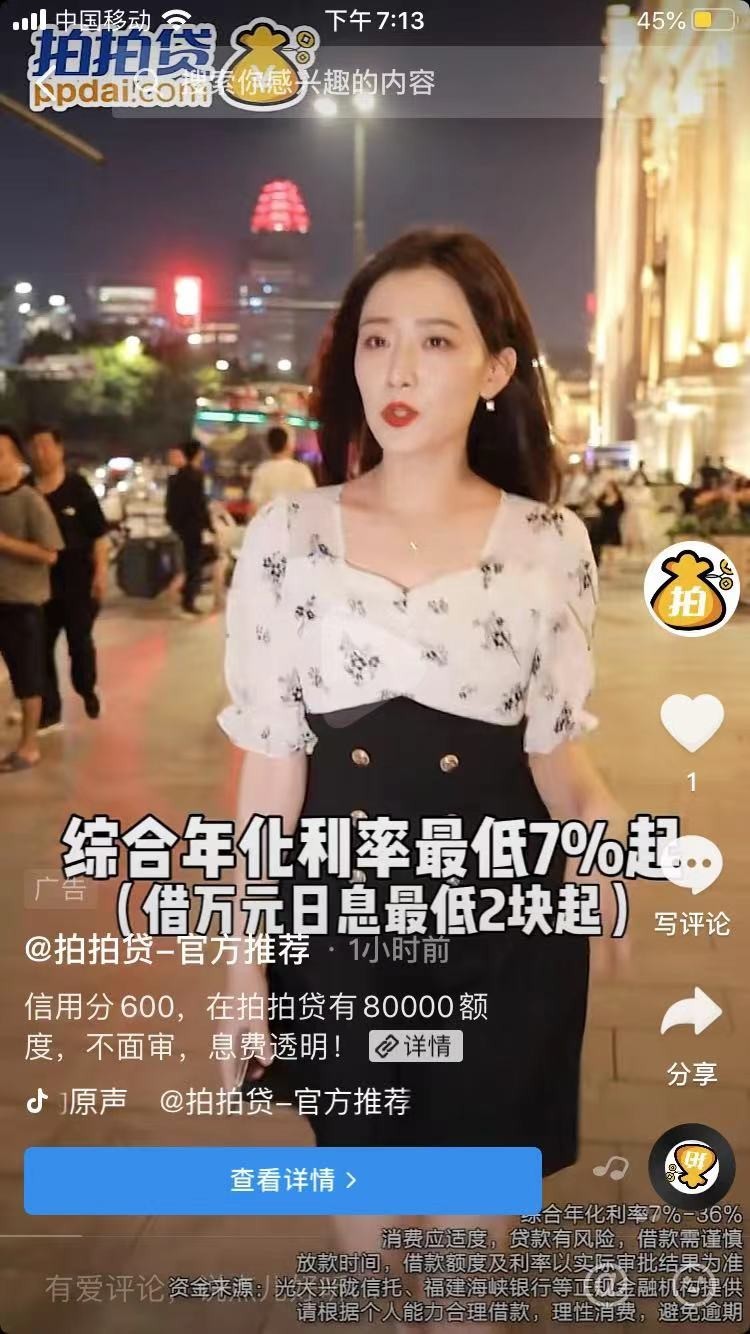 最近,在各类短视频网站上投诉广告,拍拍贷的俊男美女广告颇为抢眼,“我有拍拍贷,万元日息最低2块起,综合年化利率最低7%,最快5分钟到账。”