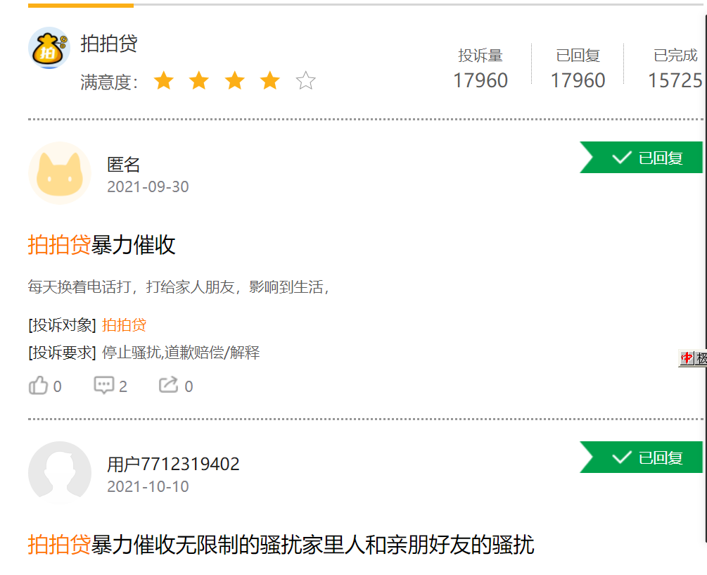 还有网友称,2019年因疫情困难在拍拍贷借款,自己无力偿还,并非恶意逾期,还款总金额不降反升,而拍拍贷一次次爆通讯录并恐吓,甚至谎称是法务部,恐吓我威胁我短信轰炸,给亲戚朋友打电话,甚至伪装当地干部进行威胁恐吓,给本人造成严重的心理负担。“
