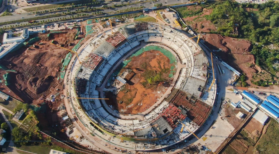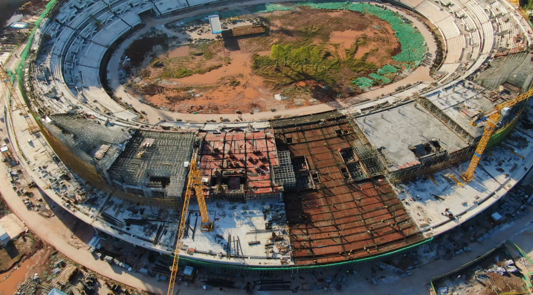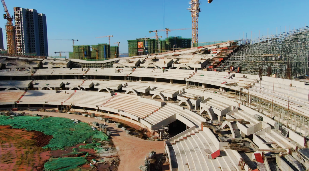(综合体育场A区、C区已完成多段主体混凝土结构封顶)