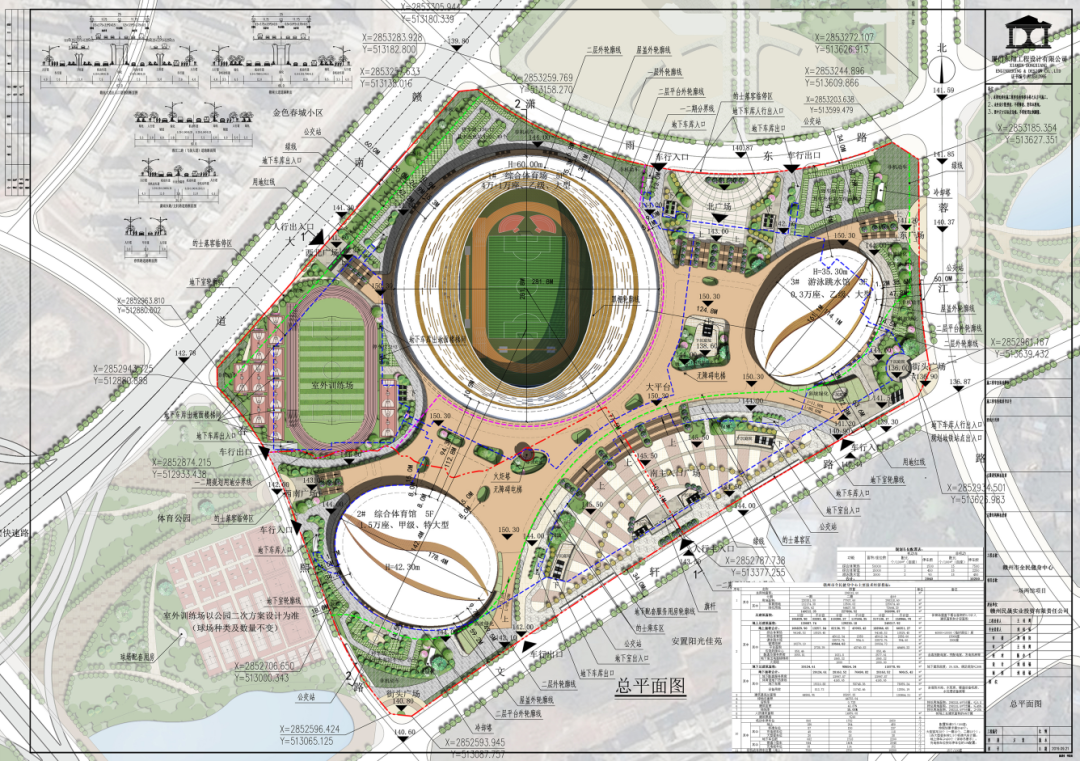 赣州市全民健身中心项目位于蓉江新区赣南大道金色春城小区对面,由赣州城投集团组织实施建设。项目分两期建设,其中,一期先行实施4万固定座+1万活动座的综合体育场(含一个室外训练场),投资约16亿元,用地面积为200余亩,建筑面积约14万平方米。
