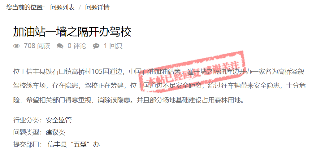 经铁石口镇实地调查,该驾校练车场占地面积约15亩,由驾校投资人向土地所有人(已办理国有土地使用证)租赁而来。经实地踏勘及核对土地使用证范围图,该驾校场地用地范围未超过土地使用证范围,不存在占用森林用地行为。该驾校练车场西靠105国道,有围墙和房屋相隔,距离约10米;北靠中国石油加油站围墙,因驾校练车场并非易燃易爆场所且在周边建有围挡设施,对加油站不存在安全隐患。