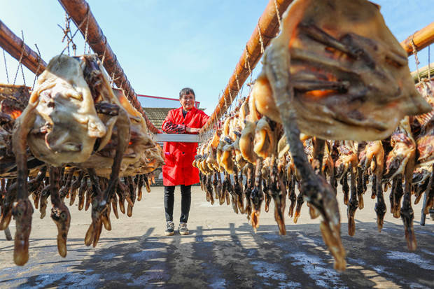 孙渡街道素有“中国鸭乡”之美誉,近年来,当地大力发展集养殖、屠宰、加工、生产、销售为一体的麻鸭产业。孙渡板鸭作为特色麻鸭产品之一,在沿袭板鸭传统制作工艺的同时,研发出酱鸭、手撕鸭、鸭三件等新品种,通过“线上+线下”的销售模式,畅销全国各地,广受市场欢迎。每年10月份后,当地板鸭生产企业纷纷开始加工生产板鸭,有效带动当地农民增收致富,助力乡村振兴。(占佩璐 摄)