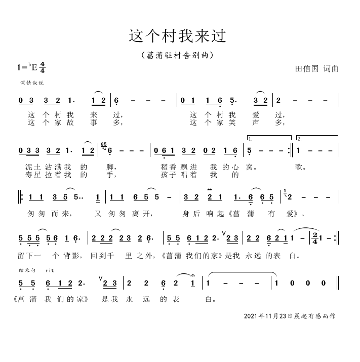 《这个村我来过》是江西省教育评估监测研究院乡村振兴驻村工作队队长兼第一书记田信国为自己告别驻村工作而作词作曲并演唱的歌。2021年7月20日田信国带队进驻赣州市寻乌县菖蒲乡菖蒲村后,用心用情用力为群众办实事,深受广大村民和乡贤的欢迎与好评,在不到五个月的时间里,田信国精心创作村歌《菖蒲有爱》,首次设立高考奖学金,创意打造长寿村品牌,积极组织为寿星献爱心送温暖活动和拍抖音MV,创意主办菖蒲村寿星影展,隆重推出稻田歌会,策划实施《菖蒲会见》红色主题墙绘,主动打造菖蒲学生山歌队并为其量身定制方言歌曲《菖蒲我们的家》,组织南昌名师来送教,联系爱心企业为全乡1230名学生和全体老师捐赠礼物、为村民捐赠优质杂交稻种……可谓亮点纷呈,精彩不断,受到各大媒体热推,使得昔日默默无闻的菖蒲村如今远近闻名。因工作变动,田信国近日结束驻村,有感而发,写下《这个村我来过》这首歌,朴实的歌词,悠缓的旋律,深沉的演唱,倾诉了他对菖蒲这块土地和乡亲们的不舍之情,感动了无数善良淳朴的菖蒲村民。