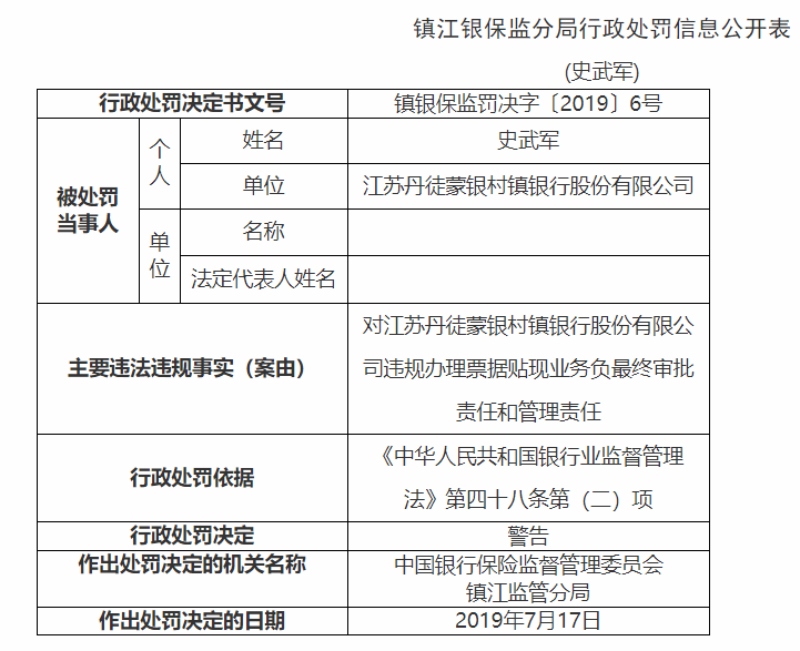 中国银保监会发布的处罚公告显示,2019年7月24日,丹徒蒙银因违规办理票据贴现业务被罚款40万元。原行长史武军、风险控制部主任张晖作为相关负责人,分别因为对丹徒蒙银违规办理票据贴现业务负最终审批、管理责任和主调查、管理责任被给予警告处分。