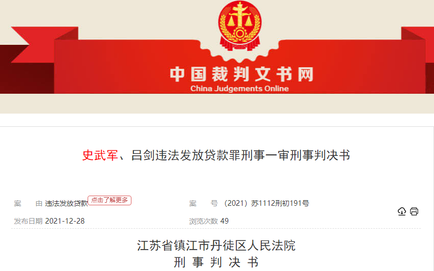 2021年12月28日,江苏省镇江市丹徒区法院发布了关于史武军、吕剑违法发放贷款罪刑事一审的裁判文书。判决书显示,江苏丹徒蒙银村镇银行股份有限公司(以下简称丹徒蒙银)原行长史武军、副行长吕剑明因违规放贷1900万元双双获刑。二人被判处有期徒刑三年,适用缓刑,并处罚金人民币一万元。