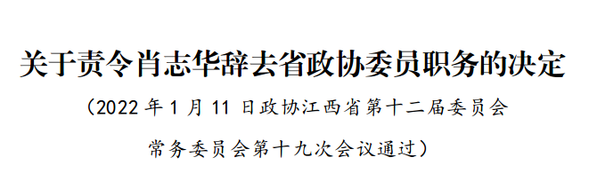鉴于肖志华涉嫌严重违纪违法,正在接受省纪委省监委纪律审查和监察调查,已被责令辞去政协江西省第十二届委员会委员职务,依照《中国人民政治协商会议章程》及有关规定,政协江西省第十二届委员会常务委员会第十九次会议决定,接受肖志华被责令辞去政协江西省第十二届委员会委员职务。