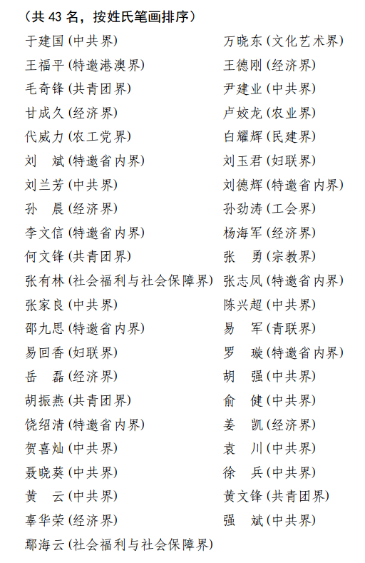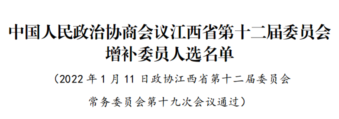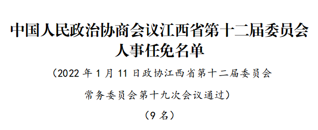 因工作岗位调整等原因,夏克勤、王英稳、赵明奎;唐朔、万国平;刘家富、吴运波、杨文英;乐文红、廖奇志、李宁、李新华、陈洪生、肖玉兰;李福如、郑声宝;雷蕾、张琳、涂婷婷、邹俊;赵军;黄宝凤、李雪梅、张丽萍等24名委员提出,请求辞去政协江西省第十二届委员会委员职务;因年龄原因,刘建平、刘贤清、黄晓波等3名委员提出,请求辞去政协江西省第十二届委员会委员职务。