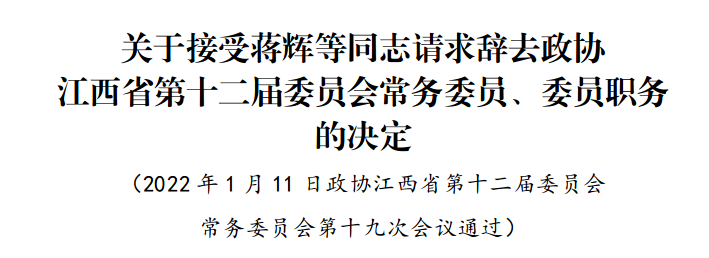 因工作岗位调整等原因,蒋辉委员提出,请求辞去政协江西省第十二届委员会常务委员、委员职务;因年龄原因,肖为群委员提出,请求辞去政协江西省第十二届委员会常务委员、委员职务。