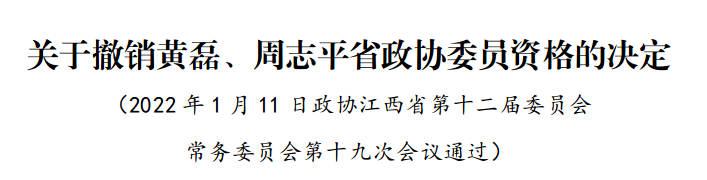 鉴于黄磊(民建会员)涉嫌危险驾驶罪,已被北京市公安局公安交通管理局海淀分局刑事拘留;周志平(无党派人士)因涉嫌严重违法,目前正接受省监委监察调查,依照《中国人民政治协商会议章程》及有关规定,政协江西省第十二届委员会常务委员会第十九次会议决定,撤销黄磊、周志平政协江西省第十二届委员会委员资格。