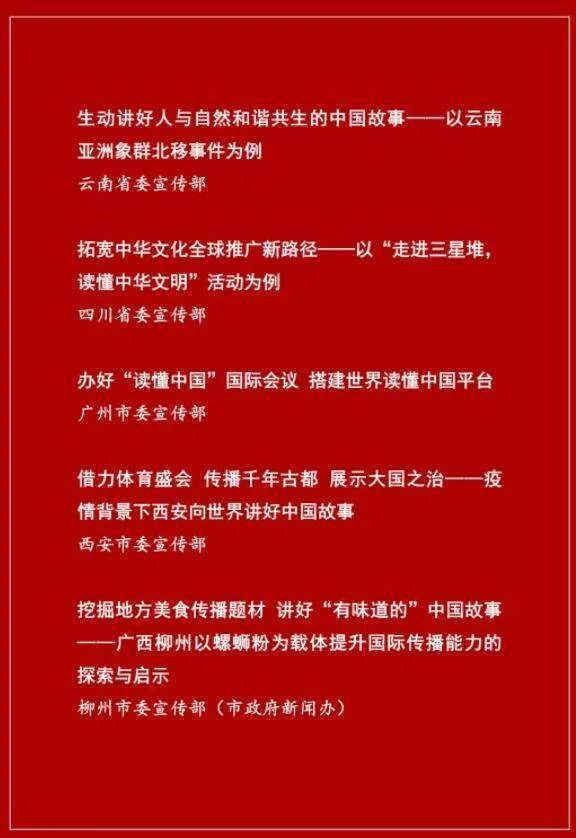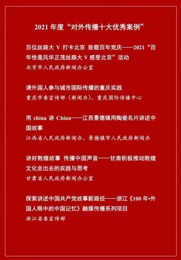 2021年9月,主办方向各省区市委宣传部(政府新闻办)征集2020年10月以来在对外传播领域取得良好效果的典型案例,涵盖突发事件的应对、对外文化交流、重大活动宣传、新闻发言人队伍建设、城市形象塑造、公共外交等多个方面;要求有广泛代表性或创新性,有值得总结和推广的经验及启示,反映对外传播实践发展的新趋势、新特点,上升到理论总结。经各地积极参与、自主申报,专家评审委员会初审、复审和终审,最终评选出 2021 年度“对外传播十大优秀案例”。