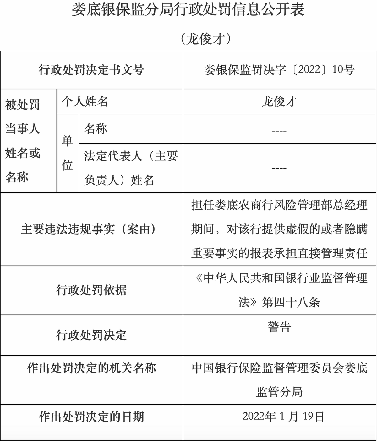 该行龙俊才在担任娄底农商行风险部总经理期间,对该行提供虚假的或者隐瞒重要事实的报表承担直接责任,因此被予以警告处分。