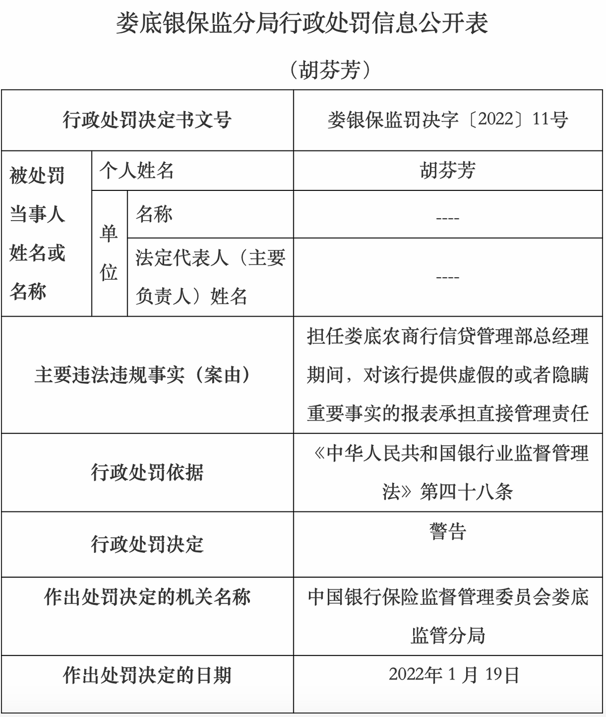 该行胡芬芳在担任信贷管理部总经理期间,对该行提供虚假的或者隐瞒重要事实的报表承担直接责任,被予以警告处分。