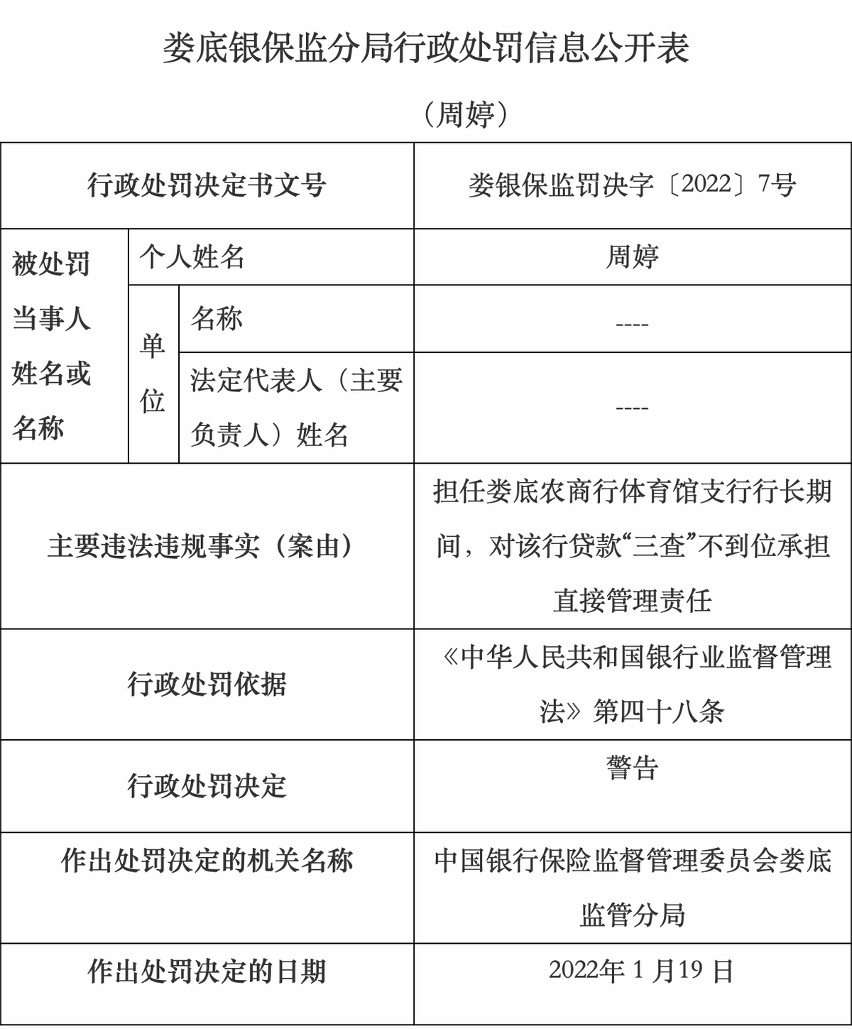公告显示,该行周婷在担任娄底农商行体育馆支行行长期间,因对该行贷款“三查”不到位承担直接管理责任,被予以警告处分。