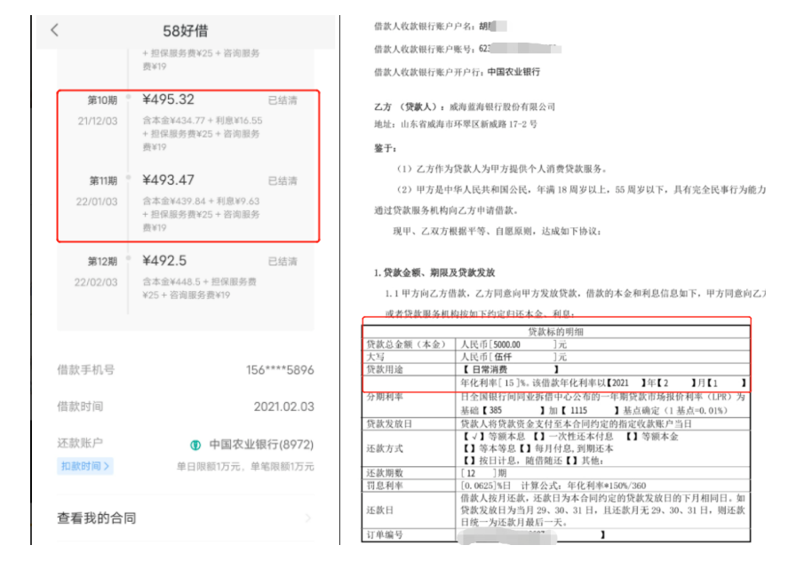 消费者胡某的投诉信息显示,其在“58好借”借款5000元,分12期偿还,每期本息449元,由此计算年化利率为15%,与合同中的数额相符。但胡某每期还需支付担保费25元,咨询费19元,这使得其综合年化利率达到了32.26%,已是合同标注利率的2倍多。