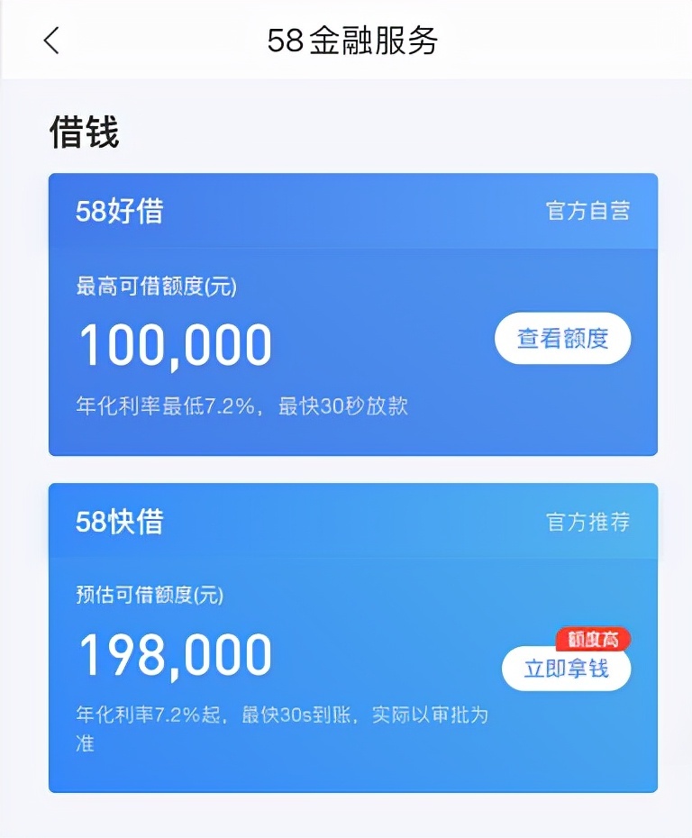 记者在58同城App中看到,58金融版块有“58好借”和“58快借”两款消费贷产品。其中,58好借是58金融专为58优质用户提供的小额循环信贷服务,额度为500元-200000元。58快借则是58金融与合规放款机构合作推出的产品,由合作机构为用户提供资金支持。两款产品的年化利率都是7.2%起。