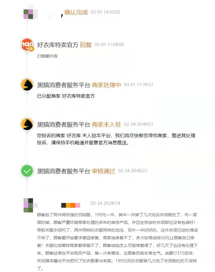 然而,值得注意的是,在记者与好衣库就此问题进行沟通后,此前被黑猫平台“拒绝分配”的投诉却于3月1日分配到好衣库特卖,并被计入商家的总投诉量。
