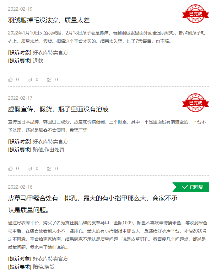 记者梳理发现,此前,在黑猫投诉、“电诉宝”等投诉平台,好衣库也因虚假宣传、虚假发货、退货未退款、退店保证金不退还等问题被用户投诉。