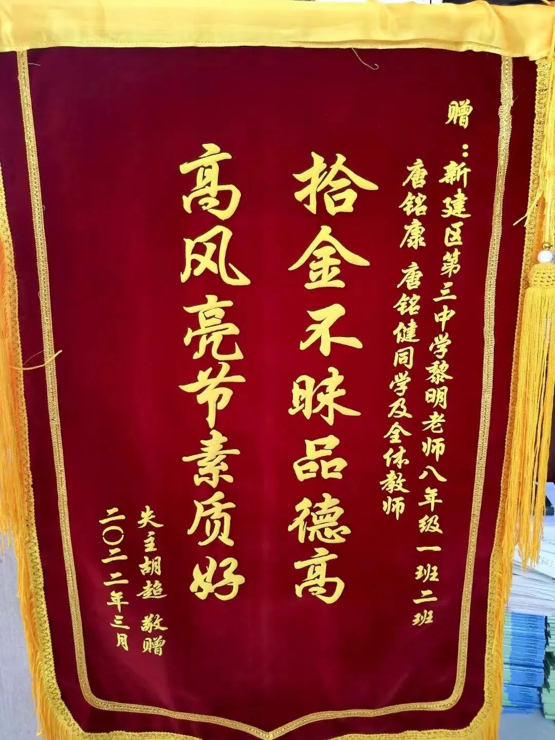 拾金不昧是中华民族的传统美德,也是一个人高尚品质和崇高社会责任感的具体体现。3月15日中午,新建三中大门值班室收到了一面锦旗,感谢新建三中初中部八(1)班唐铭康、八(2)班唐铭健两位同学拾金不昧的善举。