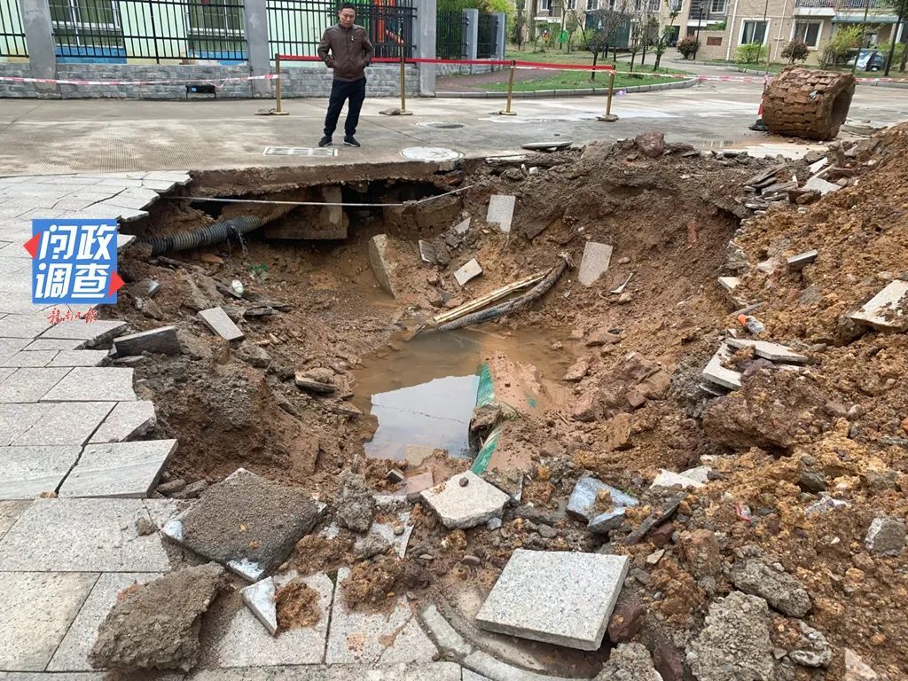 该小区物业公司一名工作人员告诉记者,3月15日中午,有居民在业主群里发了地面下陷的照片,物业工作人员及时前去查看,并设置了警戒线。同时告知幼儿园,要求他们让孩子们从另一处通道进出。该工作人员称,他们也及时联系了业主单位,有施工人员来进行了开挖,后来对方称在等材料,就停止了施工。