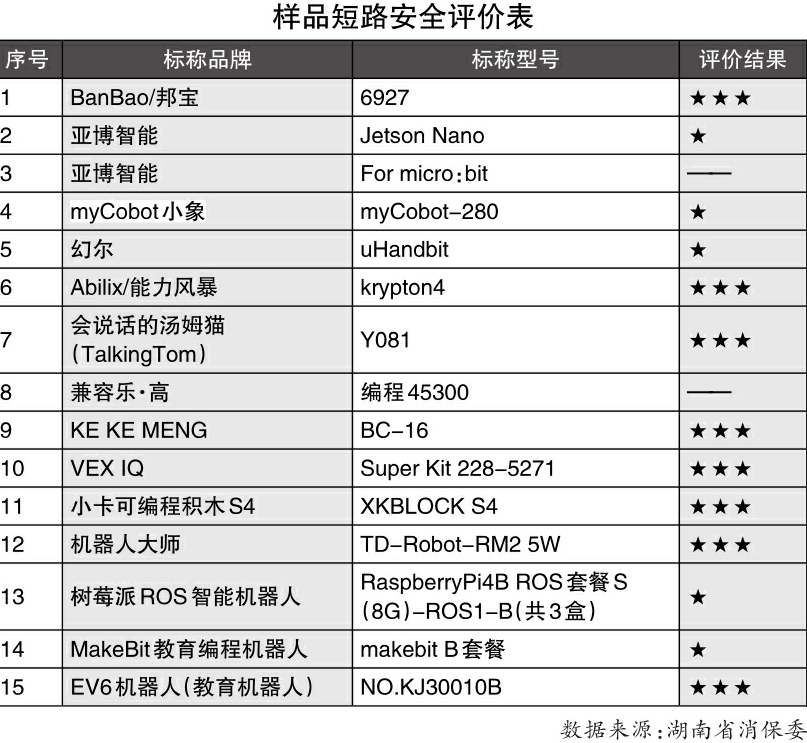 比较试验结果显示,教育机器人在安全方面存在风险,包括但不限于执行器安全、短路安全、外露部件保护。