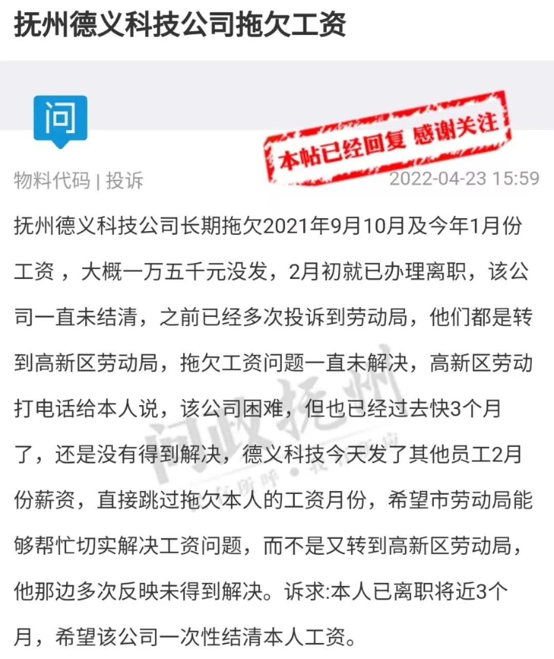 你反映江西德义半导体科技有限公司拖欠你2021年9月份、10月份和2022年1月份工资的问题,经我局调查属实。经查:该公司拖欠你2021年9月份工资6251.06元、10月份工资5880.56元、2022年1月份工资3083.93元, 共拖欠你工资15215.55元。 针对该单位拖欠工资一案, 2022年4月18日我局已立案并下达了限期改正指令通知书。 目前江西德义半导体科技有限公司提供了整改报告给我局,公司将在5月份留抵退税款下来第一时间处理工资拖欠问题。如若该用人单位不按时整改,我局将依法采取行政处理或行政处罚措施。