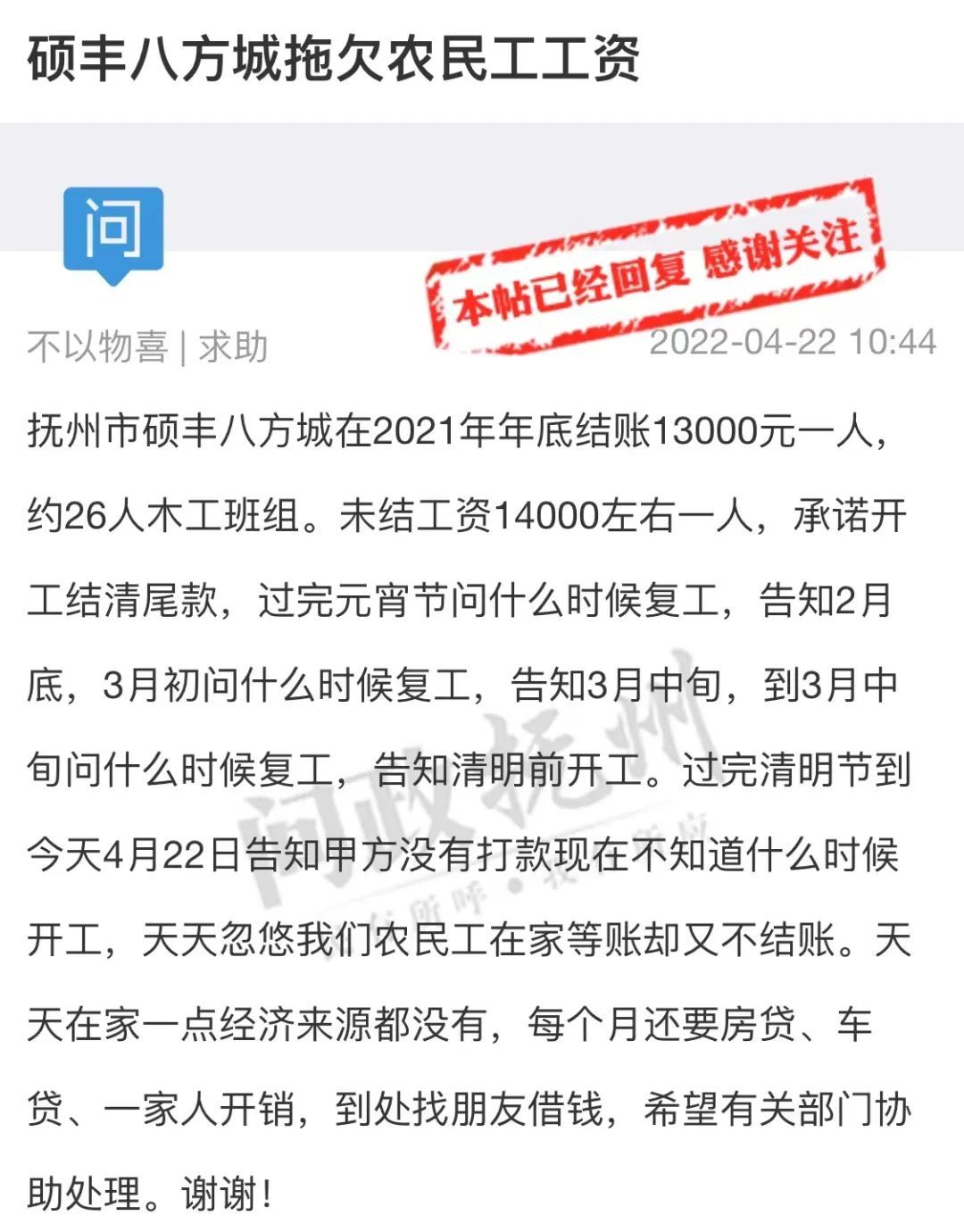 经与项目建设单位、施工总承包单位相关负责人沟通,该项目将于近期复工,因存在疫情、工资专户冻结等因素, 施工总承包单位与您所在班组就工资未结清部分达成支付协议,将于5月10日和5月底前分两次将您所在班组工资发放到位,如后续工资未按约定支付到位,可直接向抚州市劳动监察局进行反映。