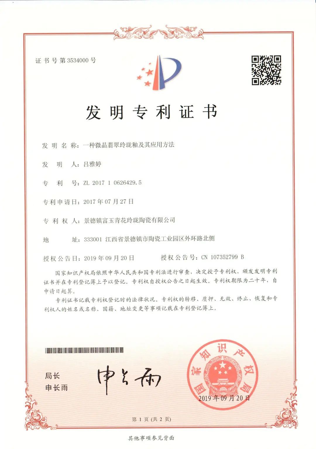 吕雅婷孜孜以求,带领团队创造多项发明专利“一种易清洗、不沾油的釉料”、“微晶翡翠玲珑釉”、百项左右外观专利以及产品登记版权证书。