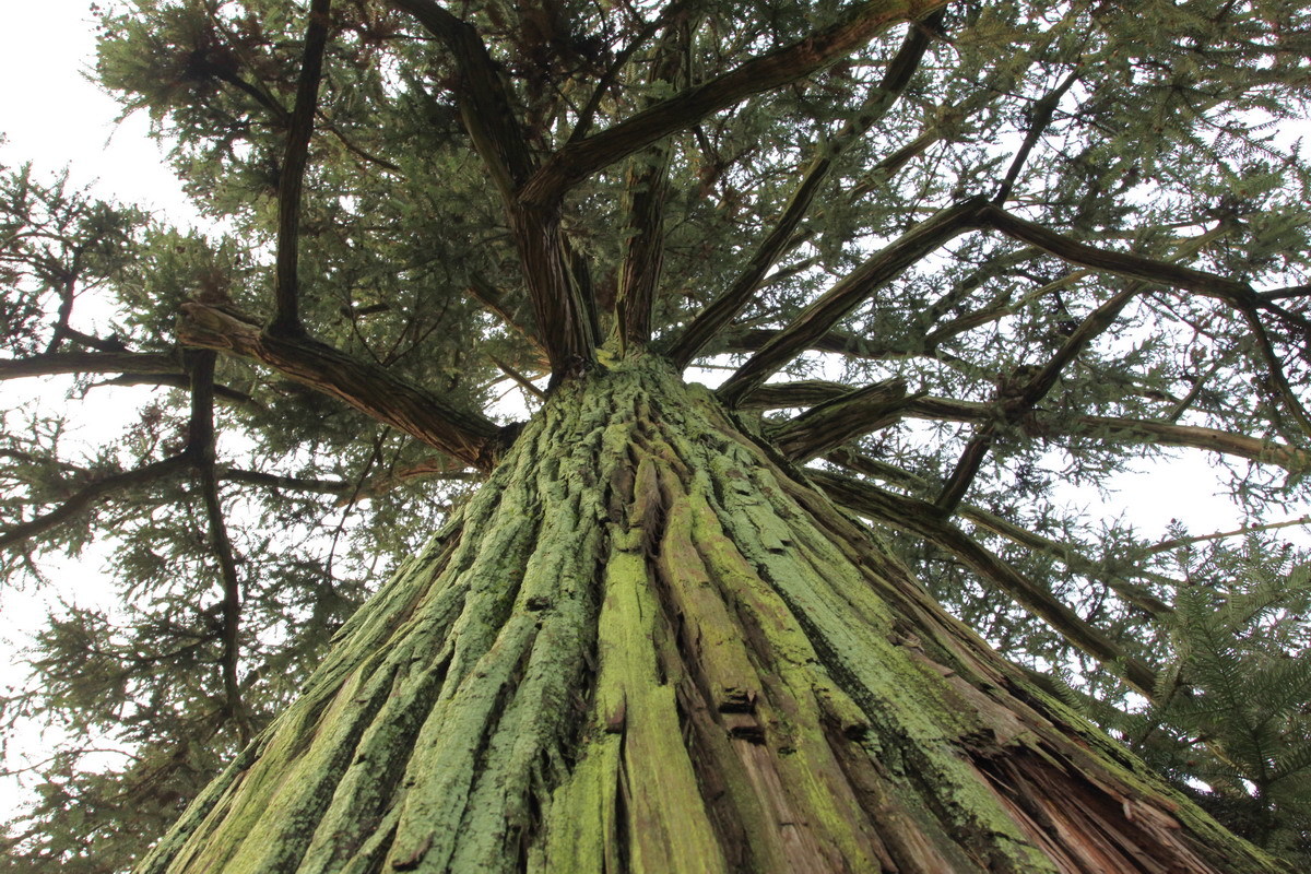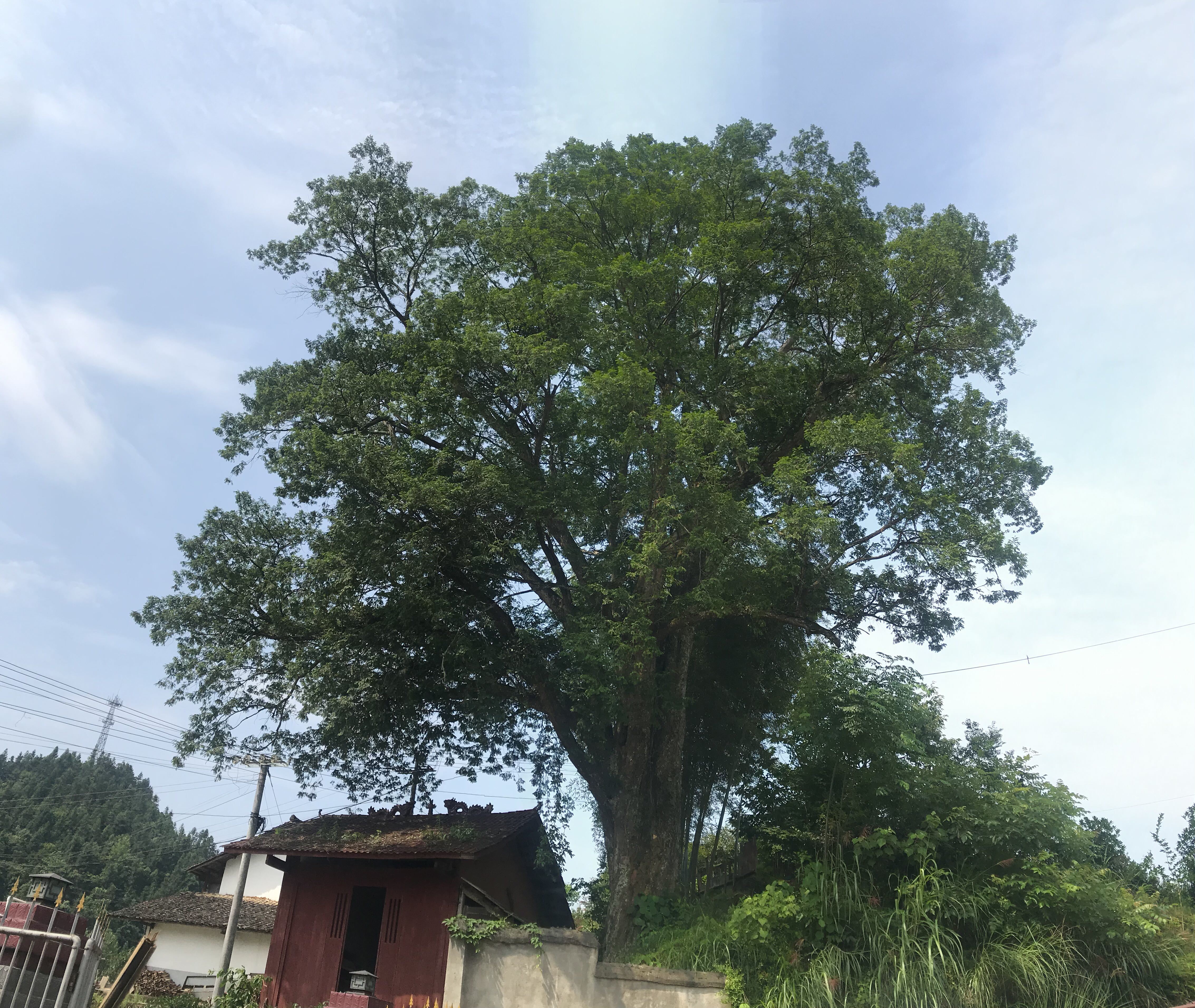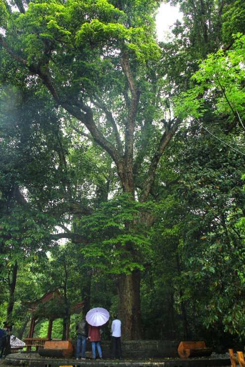 该杉树生长历史悠久,高大葱郁,主干磅礴,树冠遮天盖日,几百年来树叶茂盛,年年结果累累,却未见长高。