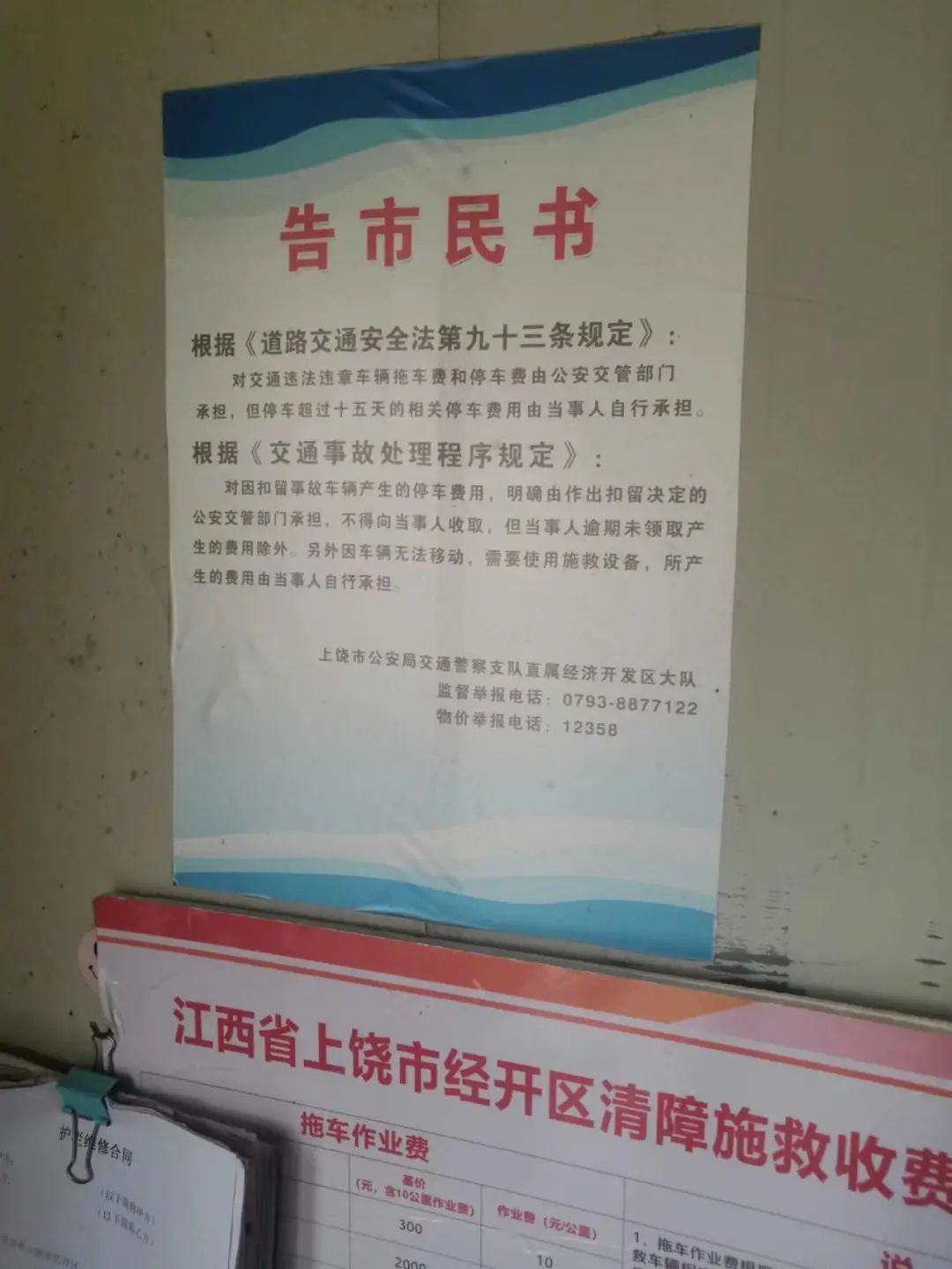 记者看到墙壁上这份“告市民书”写着:根据《道路交通安全法第九十三条规定》对交通违法违章车辆拖车费和停车费由公安交管部门承担,但停车超过十五天的相关停车费用由当事人自行承担。这份“告市民书”的落款单位是上饶市公安局交通警察支队直属经开区大队,上面还留了监督举报电话。记者仔细查阅了《道路交通安全法》,第九十三条并无停车超过十五天的相关停车费用由当事人自行承担的相关规定。