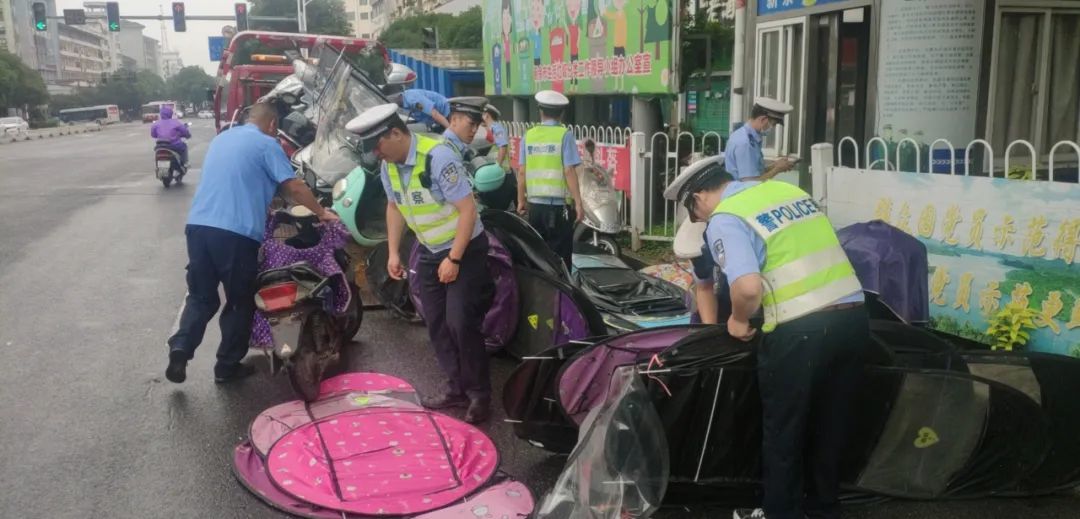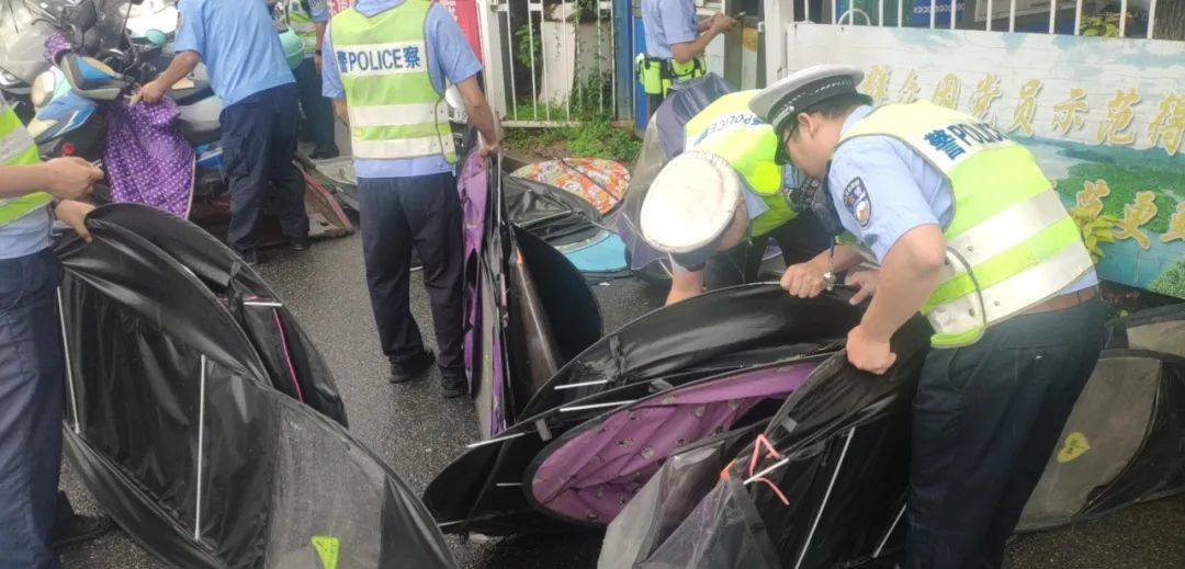 近期,新余市公安局交警支队城南大队民辅警按照支队统一部署要求,在路面严查驾乘摩托车、电动车不佩戴头盔、不分道和非法加装遮阳(雨)伞(篷)等违法行为,此次行动共拆除遮阳(雨)伞(篷)30余顶,查处不分道违法行为5起,扣留无牌无证摩托车、电动车13辆。