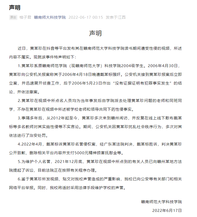 今天凌晨,赣南师范大学科技学院发布声明,黄某珍在抖音等平台发布其在赣南师范大学科技学院读书期间遭受性侵的视频,所述内容不属实。目前,该校已向公安等有关部门和相关网络平台举报,将适时采用法律手段维护学校的声誉。