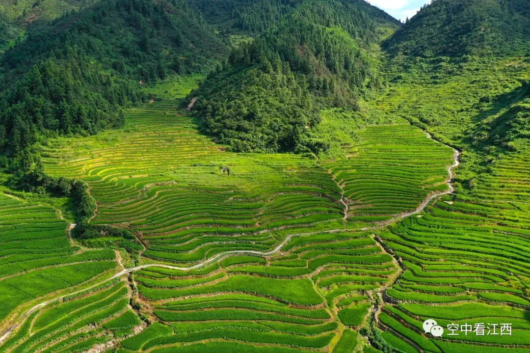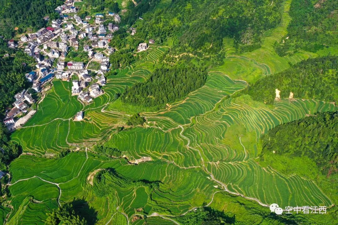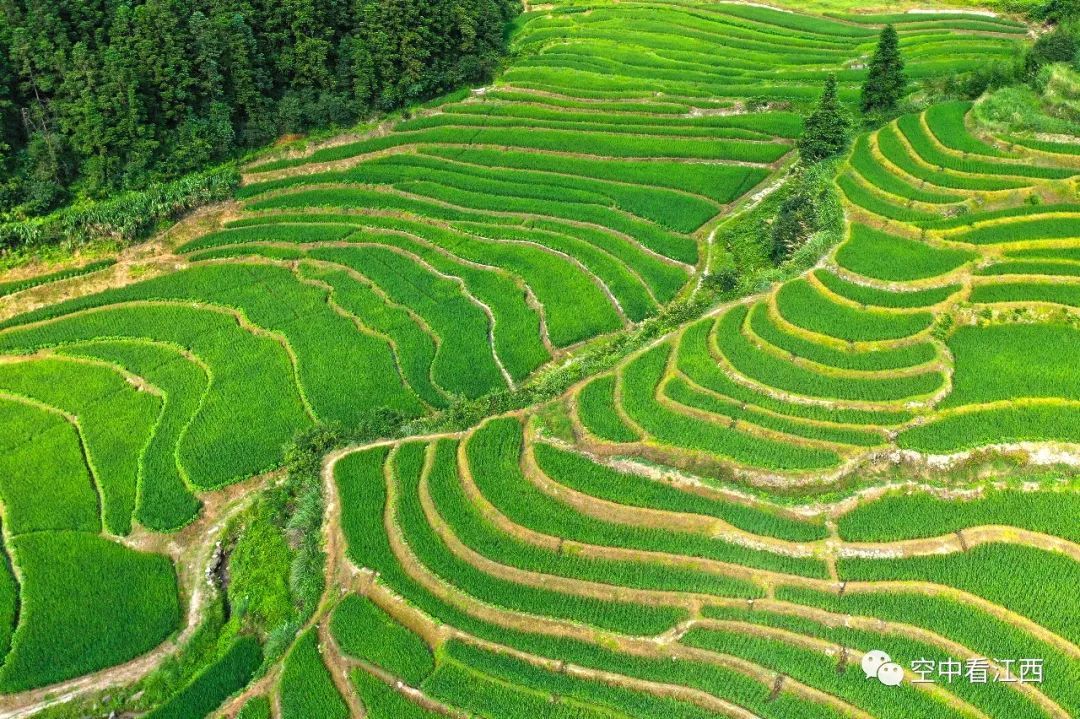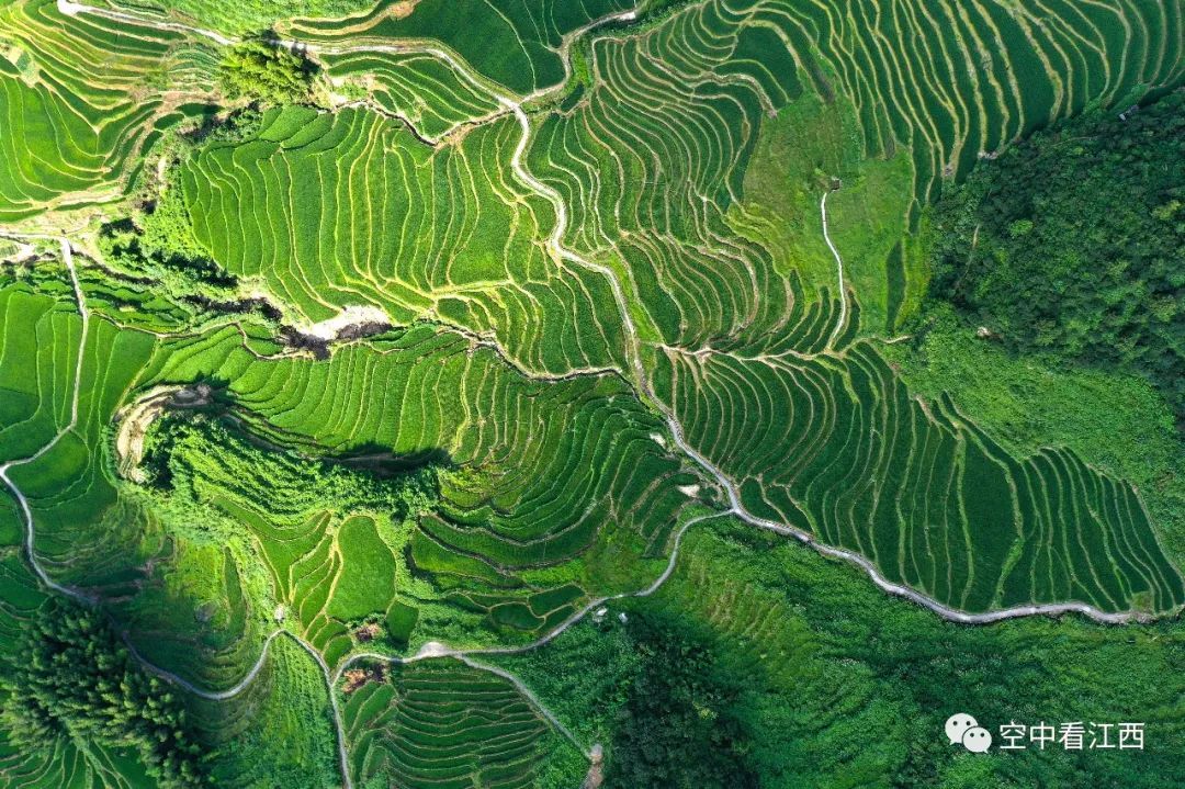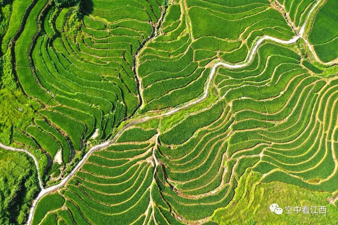 7月20日,盛夏时节,航拍位于江西省吉安市遂川县珠田镇的珠溪梯田。这里的梯田密集,海拔高、山势陡,形态原始,阡陌纵横,从空中俯瞰层层叠叠,线条优美流畅,蔚为壮观。
