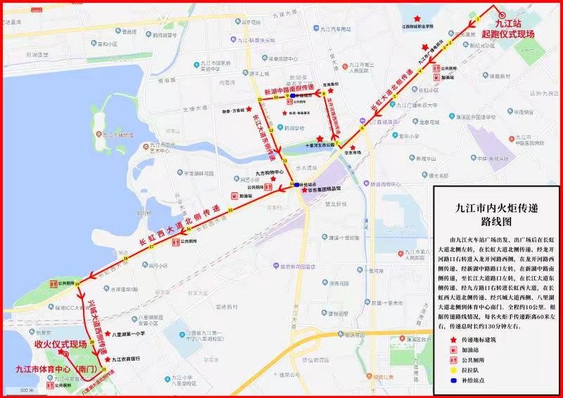 火炬传递将从九江火车站广场开始,出广场后在长虹大道北侧左转,在长虹大道北侧传递、经龙开河路口右转进入龙开河路西侧,在龙开河路西侧传递、经新湖中路路口左转,在新湖中路南侧传递,至长江大道路口左转,在长江大道东侧传递、经九方路口右转进长虹西大道,在长虹西大道北侧传递、经兴城大道、八里湖大道北侧到体育中心南门,全程约10公里。根据安排,中心城区传递站火炬手有160名,每名火炬手传递距离60米左右,传递总时长约3小时左右。