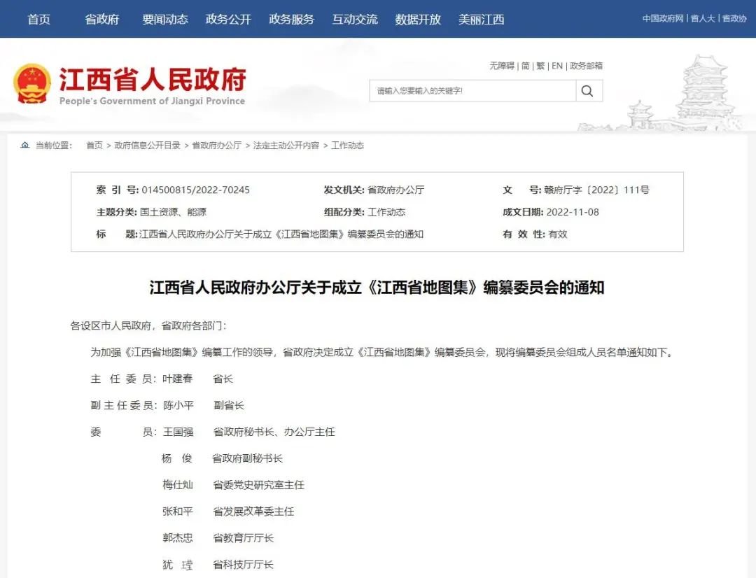 为加强《江西省地图集》编纂工作的领导,省政府决定成立《江西省地图集》编纂委员会,现将编纂委员会组成人员名单通知如下。