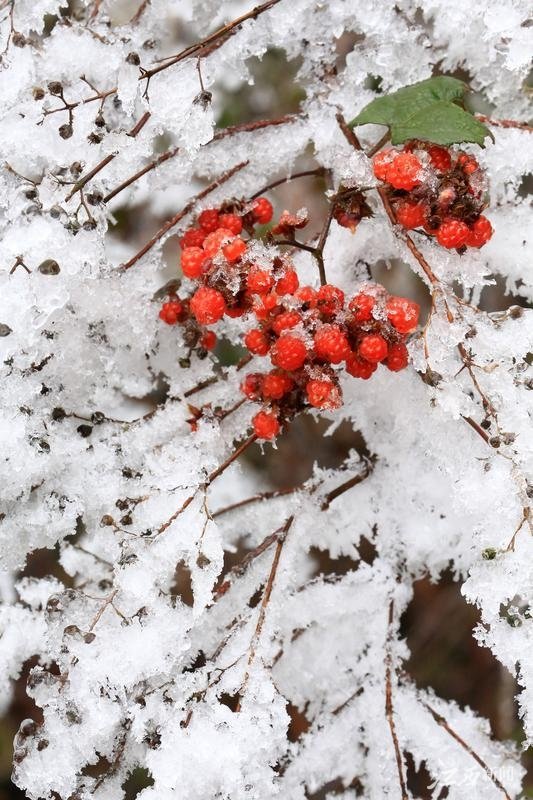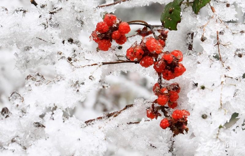 12月4日,永丰县中村乡梨树村,红色的树莓果实和白色的冰雪相映成趣。大雪节气将至,永丰县国家森林公园梨树村灵华山景区迎来今冬初雪,银装素裹、景美如画。通讯员 刘浩军摄