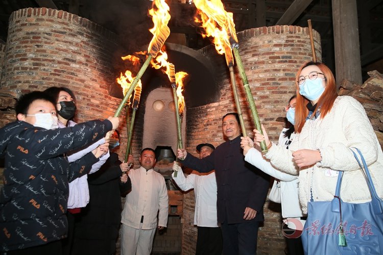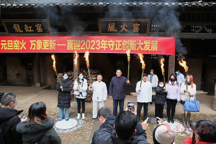 随后,非物质文化遗产传承人、把桩师傅胡家旺宣布“风火窑复烧点火”。在欢呼声喝彩声中,周荣林、胡家旺带领点火嘉宾将手中火把置入明清御窑风火窑,2023年新年第一把火在窑内熊熊燃起,象征着中国文化自信和斗争精神,在前进的道路上,虽然充满着各种困难,但是要像童宾、唐英等千百年来的无数陶瓷英雄先贤一样,弘扬斗争精神,不断开拓进取,在当代的建设发展中,不断取得新的成绩和进步!活动现场欢乐气氛达到高峰,大家互相送上新年最美好的祝福,以饱满的热情迎接新年的到来。
