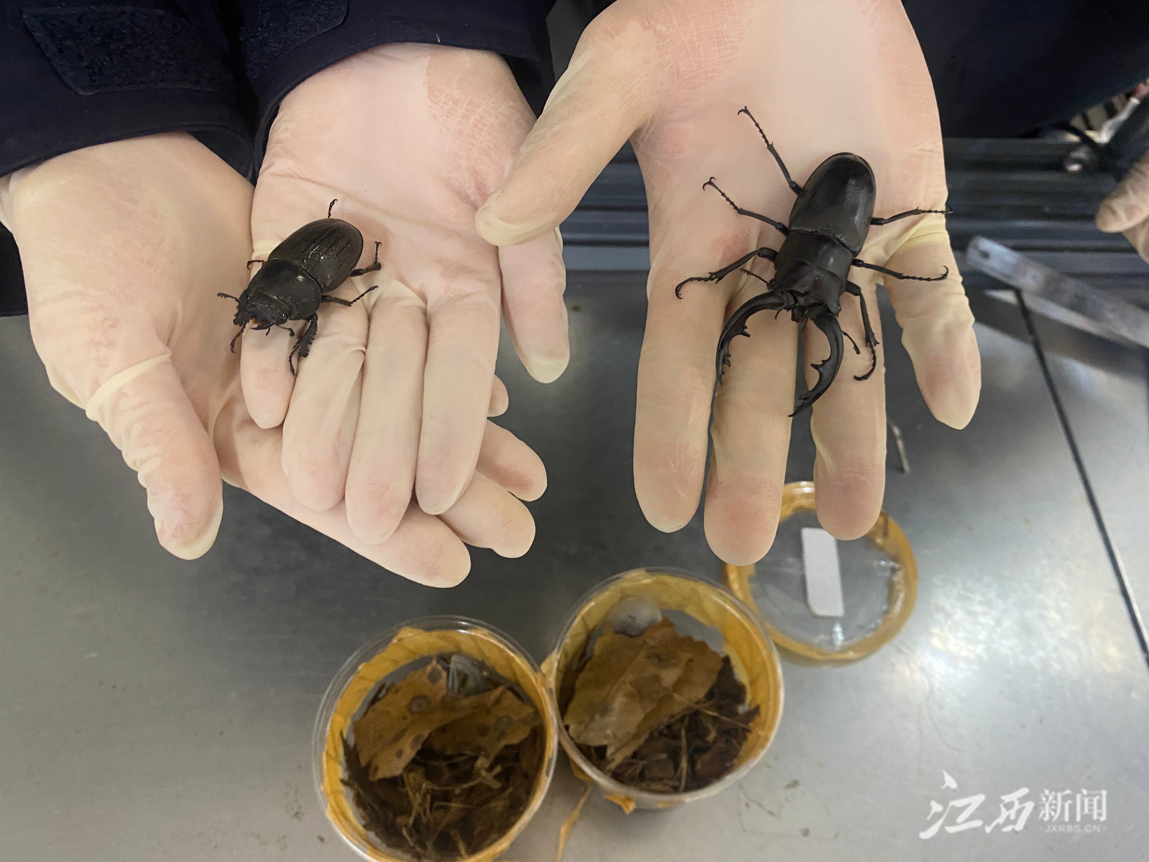 2022年12月27日,南昌海关所属昌北机场海关现场关员在对进境邮件进行监管时,发现1件申报为“玩具”的邮件过机图像存在异常,随即根据风险布控指令开展二次重点审图和开箱查验。经查,邮包内有两个用木屑填充的透明塑料盒,分别装有一公、一母两只活体甲虫,公甲虫体长77毫米,母甲虫体长48毫米。