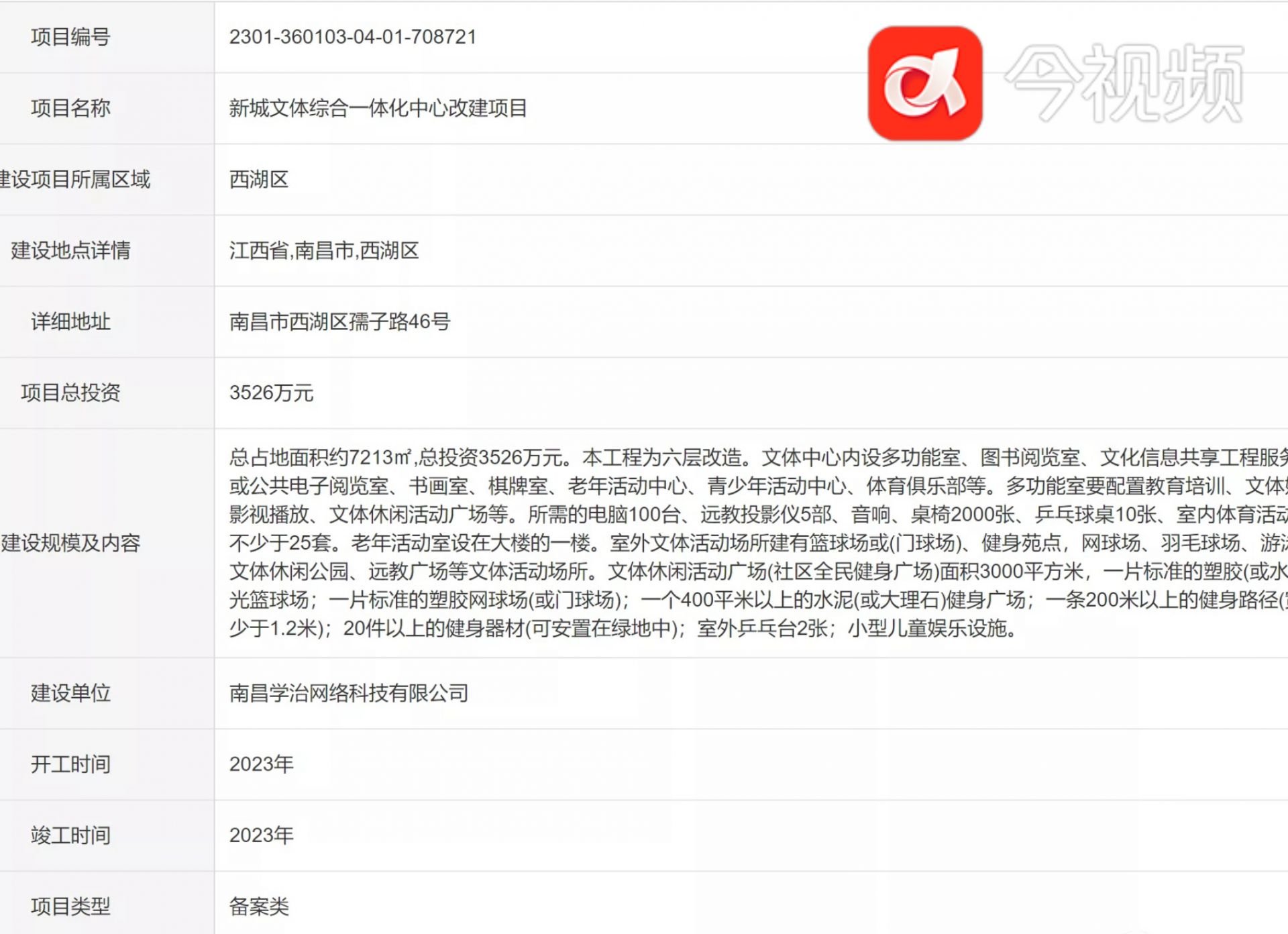 从备案信息看,该项目名称为新城文体综合一体化中心改建项目,建设项目所属位于西湖区,项目总投资3526万元。